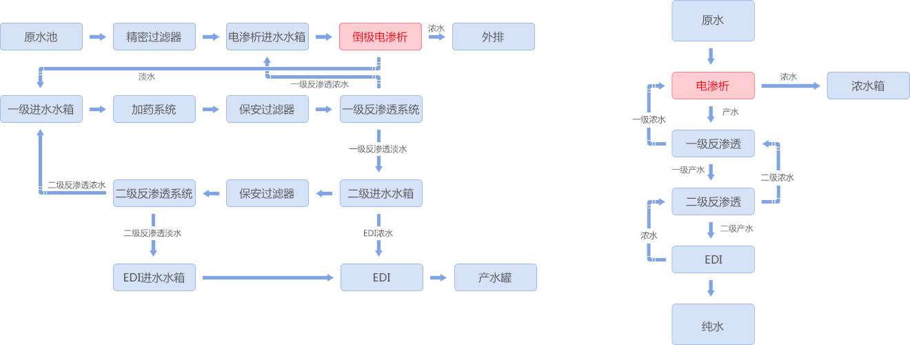 熱電廠反滲透濃水經電滲析處理到鍋爐用水標準。反滲透濃水電導率3700μS/cm,水量150m³/h,經電滲析處理后,電滲析濃水出水26m³/h,含鹽量11118mg/L。進一步,電滲析淡水進入反滲透系統,反滲透淡水進一步經EDI處理為鍋爐用水,EDI產水電導率≤0.2μS/cm,pH值7±1。